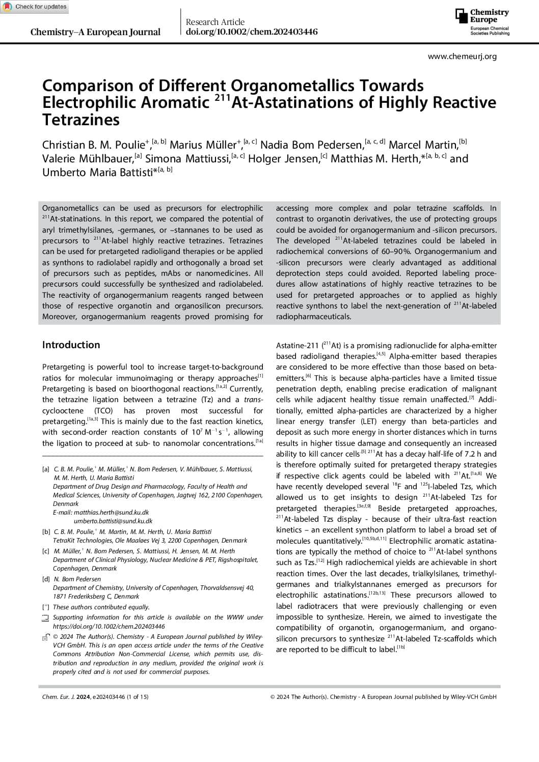 TetraKit team members have co-authored a new paper on the astatination of tetrazines, now published in Chemistry – A European Journal. We’re excited to share it with you! In this paper, they describe the synthesis and radiolabeling of various relevant tetrazine scaffolds using astatine-211. It’s open-access, so feel free to take a look!