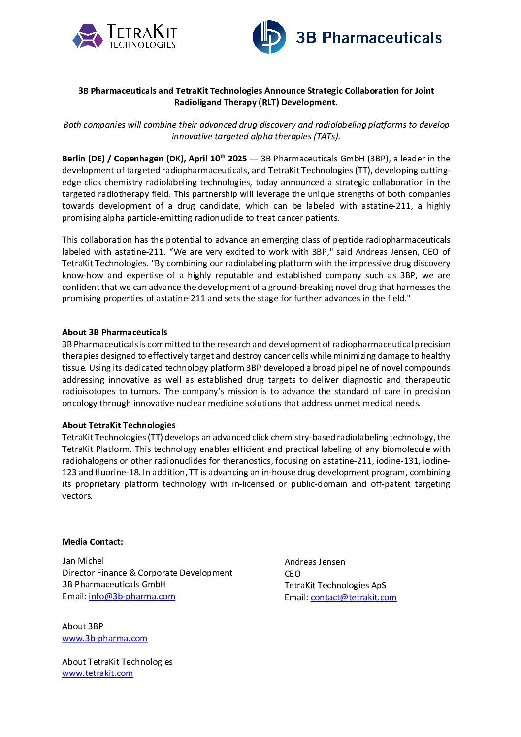 📣 TetraKit Technologies has entered into a strategic collaboration with 3B Pharmaceuticals to co-develop a targeted alpha therapy (TAT) using astatine-211.